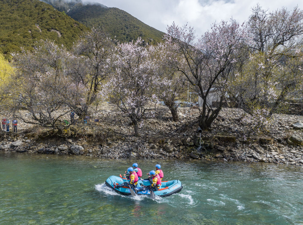 選手們?cè)谶M(jìn)行兩人漂流艇競(jìng)速賽比賽(4月20日攝,無人機(jī)照片)。新華社記者 孫非 攝