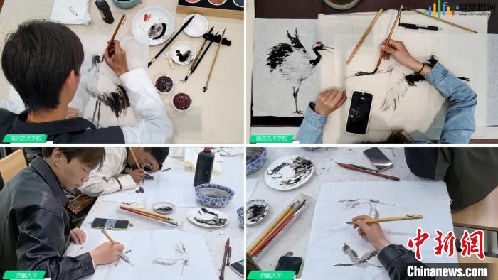 西藏大學(xué)藝術(shù)學(xué)院學(xué)生與南京藝術(shù)學(xué)院學(xué)生在線上共同繪制黑頸鶴。智慧樹平臺供圖