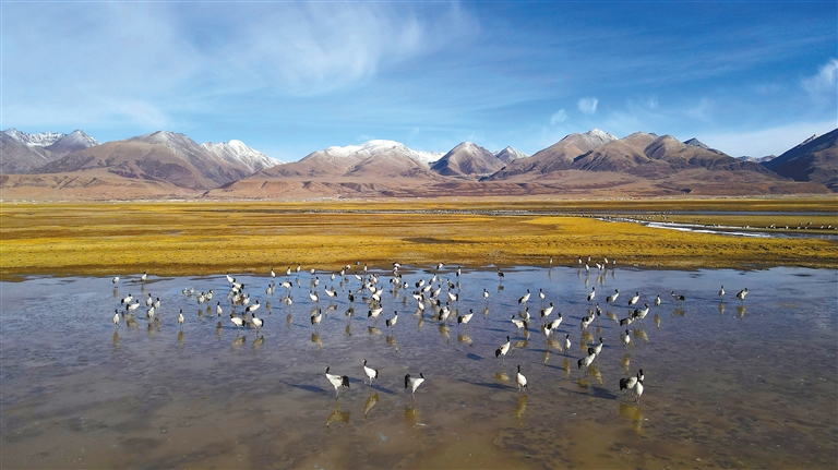 黑頸鶴在阿熱濕地棲息。益西旦增 攝