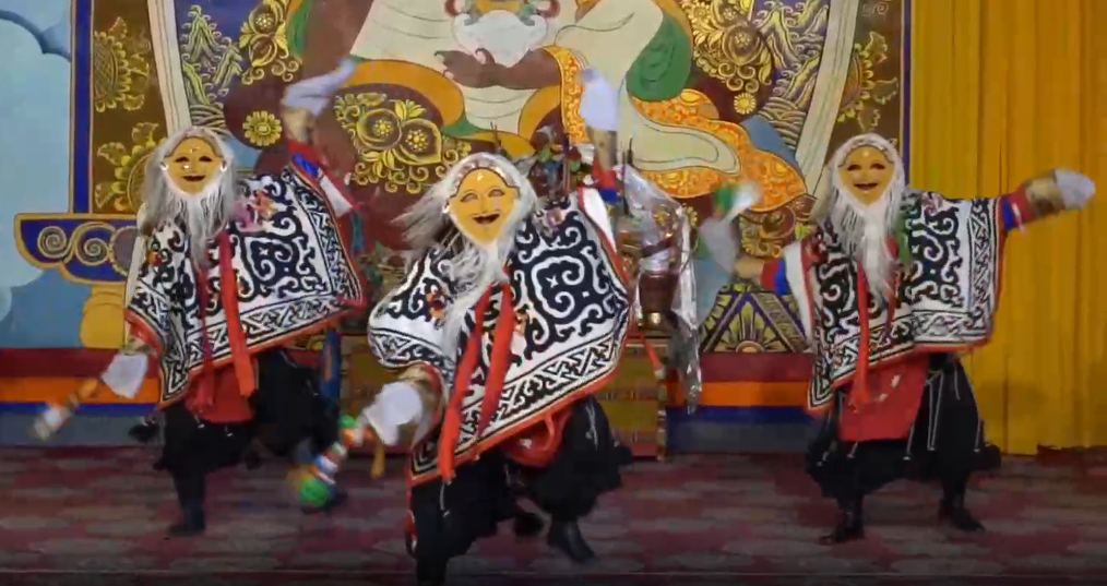傳統(tǒng)藏戲的服裝從頭到尾只有一套,演員無(wú)需化妝,主要是戴面具表演。整體上看,藏戲分為白面具戲和藍(lán)面具戲。在同一臺(tái)藏戲中,又會(huì)出現(xiàn)紅、白、藍(lán)、黑、黃等不同顏色面具,代表不同身份。“比如藍(lán)色面具代表獵人,黃色面具代表高僧、官員等?!蹦岈敶稳收f(shuō)。以戴黃色面具為主的扎西雪巴是白面具藏戲的杰出代表。