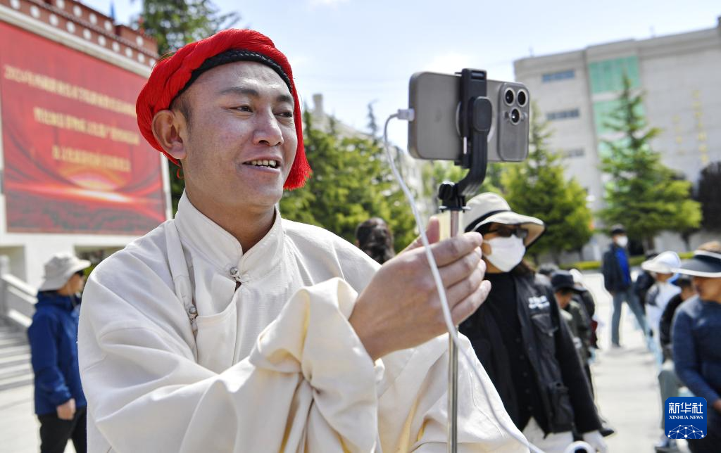 5月12日,在西藏職業(yè)技術(shù)學(xué)院職業(yè)教育活動(dòng)周啟動(dòng)儀式暨比如縣非物質(zhì)文化遺產(chǎn)進(jìn)校園活動(dòng)上,來(lái)自比如縣的一名旅游推介者在做現(xiàn)場(chǎng)直播。新華社記者 張汝鋒 攝