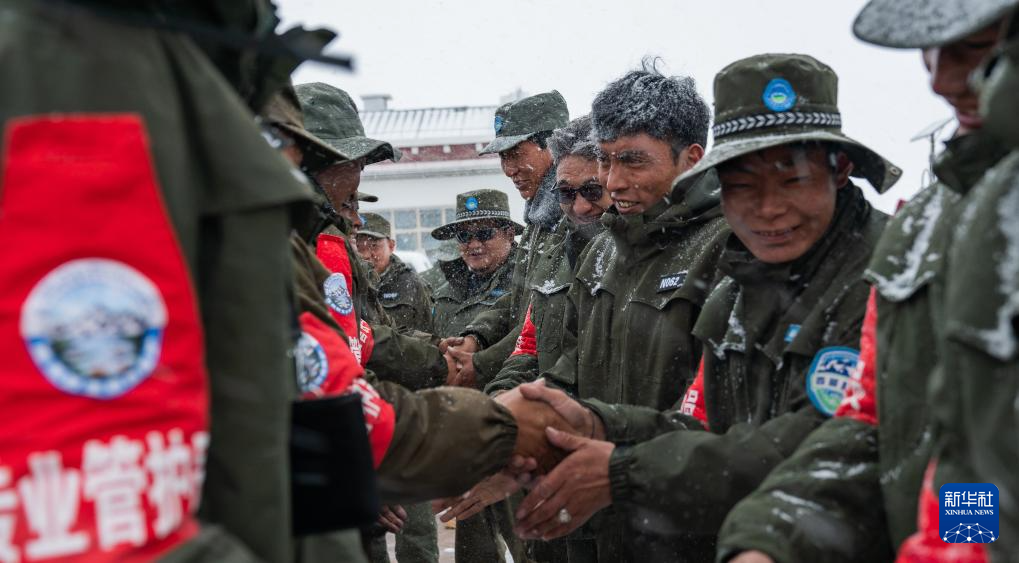布查玉管護站的野生動物管護隊員們熱情歡迎風雪中前來巡護的同事(5月7日攝)。新華社記者 丁增尼達 攝