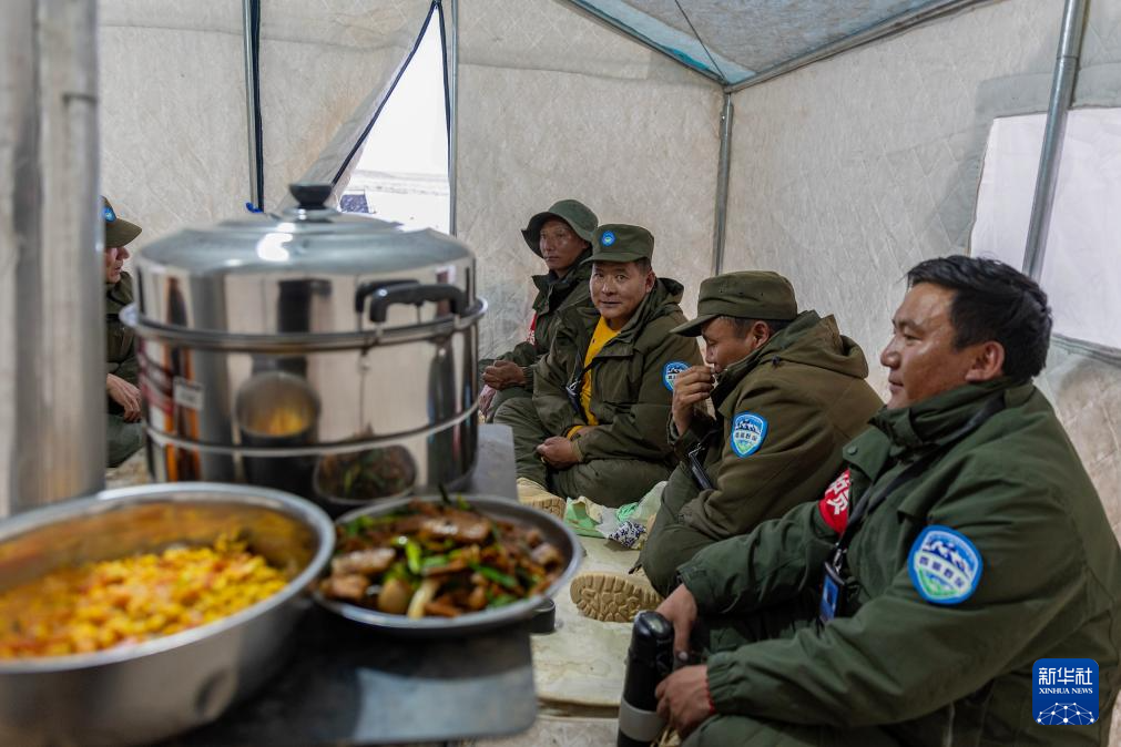 野生動物專業(yè)管護隊員們在宿營的帳篷中準備吃飯(5月7日攝)。新華社記者 姜帆 攝