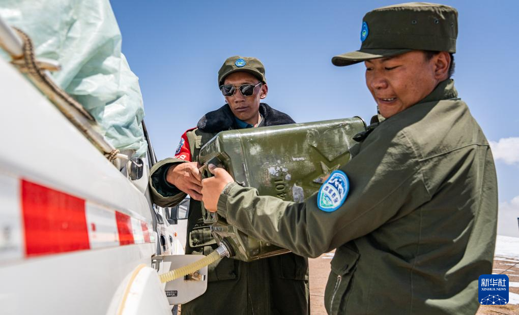 野生動物專業(yè)管護隊員在巡護途中給車輛加油(5月9日攝)。新華社記者 丁增尼達 攝