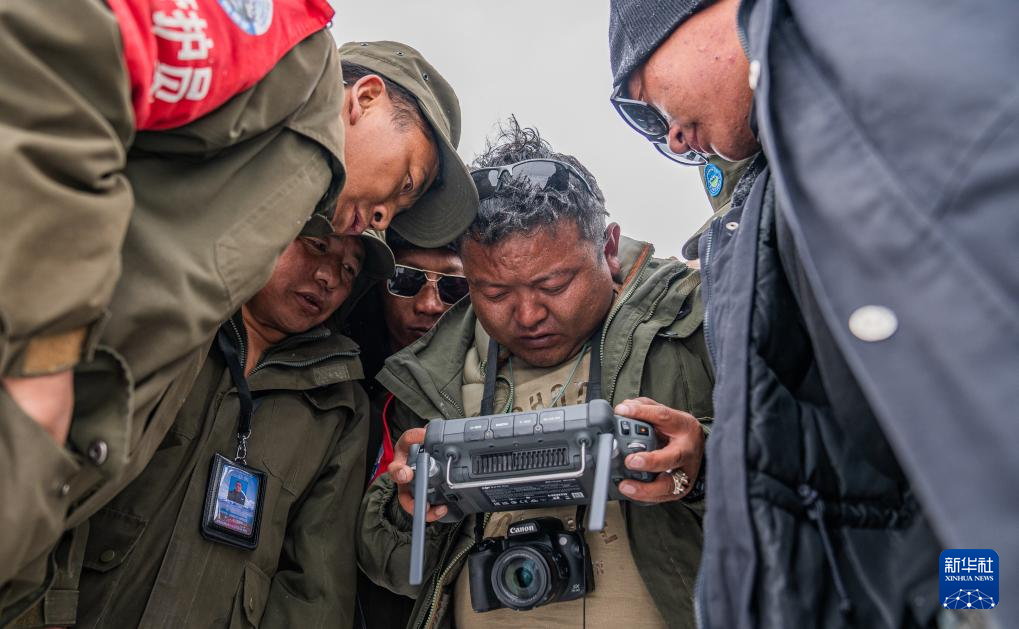 羅布玉杰管護站站長格桑倫珠(右二)和隊員們在大雪中操作無人機觀察藏羚羊遷徙情況(5月10日攝)。新華社記者 丁增尼達 攝