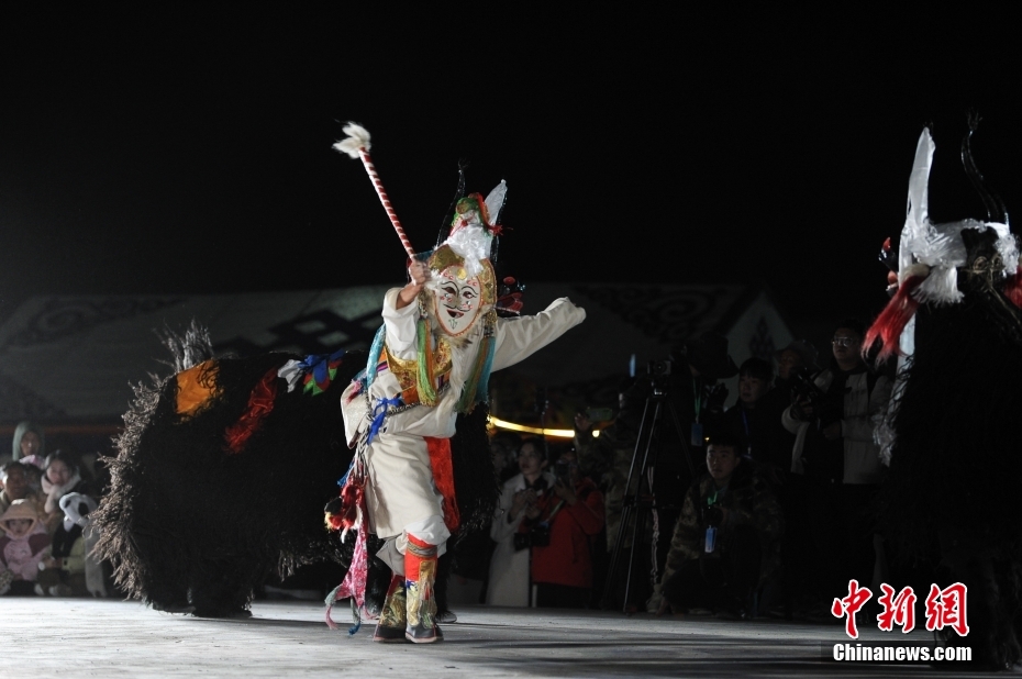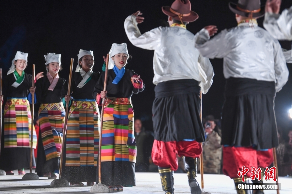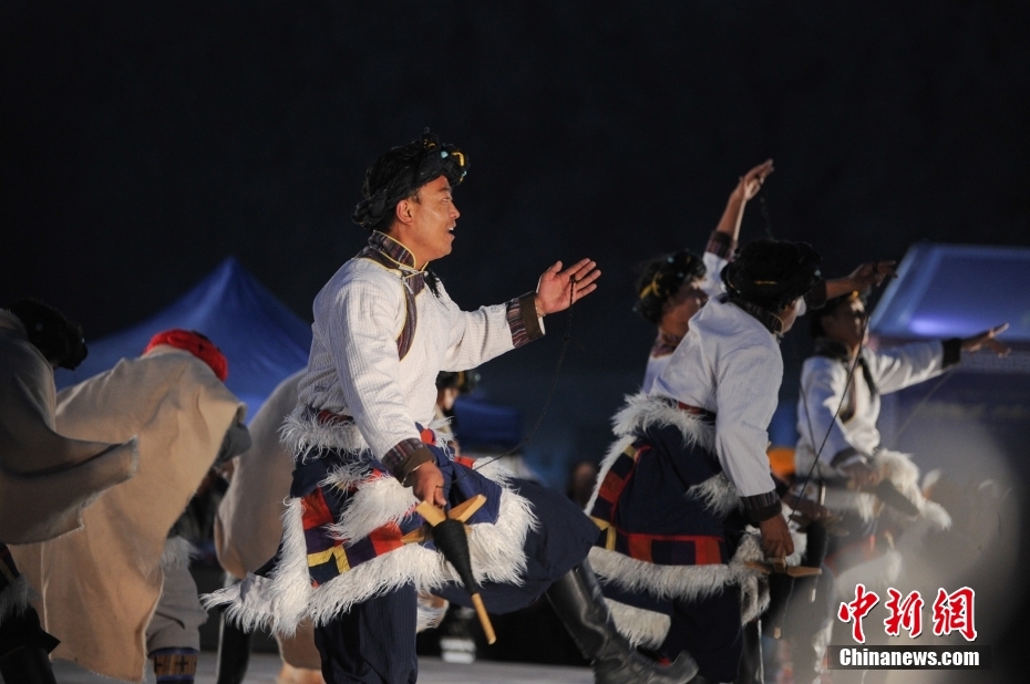 5月18日晚,西藏拉薩市當(dāng)雄縣納木錯湖畔,當(dāng)?shù)啬撩駧в慰腕w驗(yàn)篝火鍋莊舞。納木錯,被譽(yù)為“天湖”,吸引著大量游客前來觀光。圖為篝火鍋莊舞晚會上的文藝演出。