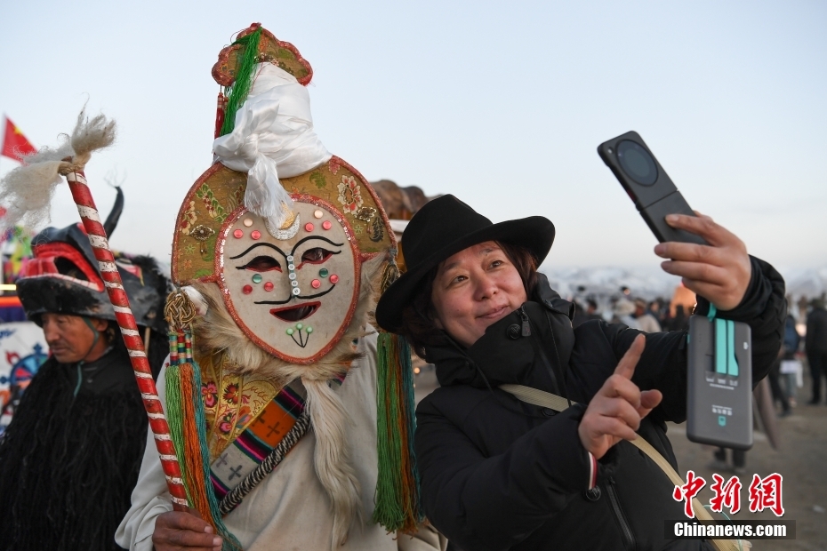 5月18日晚,西藏拉薩市當(dāng)雄縣納木錯湖畔,當(dāng)?shù)啬撩駧в慰腕w驗(yàn)篝火鍋莊舞。納木錯,被譽(yù)為“天湖”,吸引著大量游客前來觀光。圖為游客跟演職人員合影。