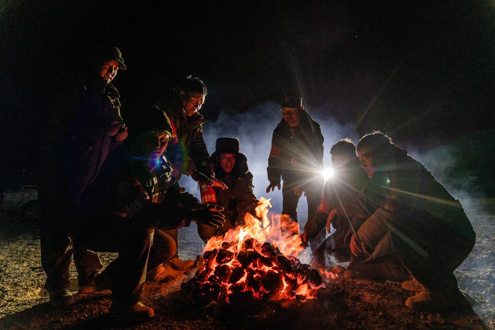 野生動物專業(yè)管護隊員在宿營地的寒夜里烤火,燃料是野牦牛的糞便(5月10日攝)。新華社記者 丁增尼達 攝