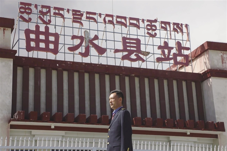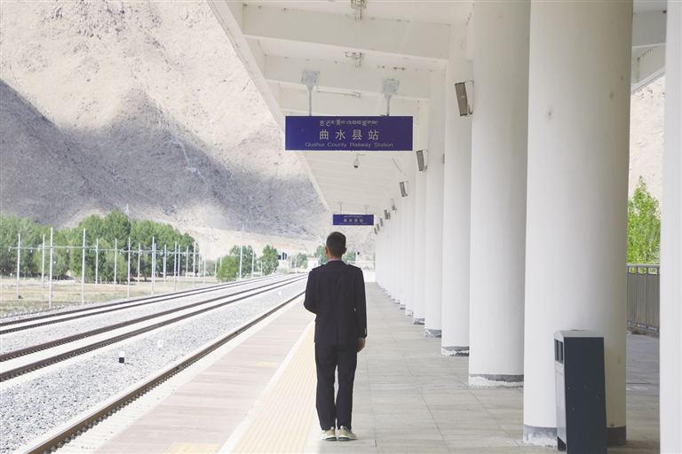 每天,清晨的第一縷陽(yáng)光還未穿透遠(yuǎn)方的山巒時(shí),車站值班員賀文貴已經(jīng)站在曲水站的站臺(tái)上,開始了他日復(fù)一日的工作,查看股道是否有異物,是否有動(dòng)物進(jìn)入站場(chǎng)。曲水站與其他站不一樣,根據(jù)工作安排,平時(shí)這里只有一個(gè)人當(dāng)班應(yīng)急值守,沒有旅客上下站,時(shí)而駛過(guò)的火車,是這里唯一的來(lái)客。目之所及,只有遠(yuǎn)處的雪山、農(nóng)田和滾滾向前的雅魯藏布江水。