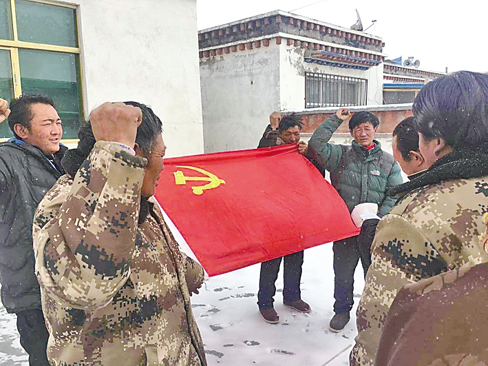 中國電信西藏公司駐霍爾巴鄉(xiāng)駐村工作隊與聯(lián)系點黨員干部重溫入黨宣誓。