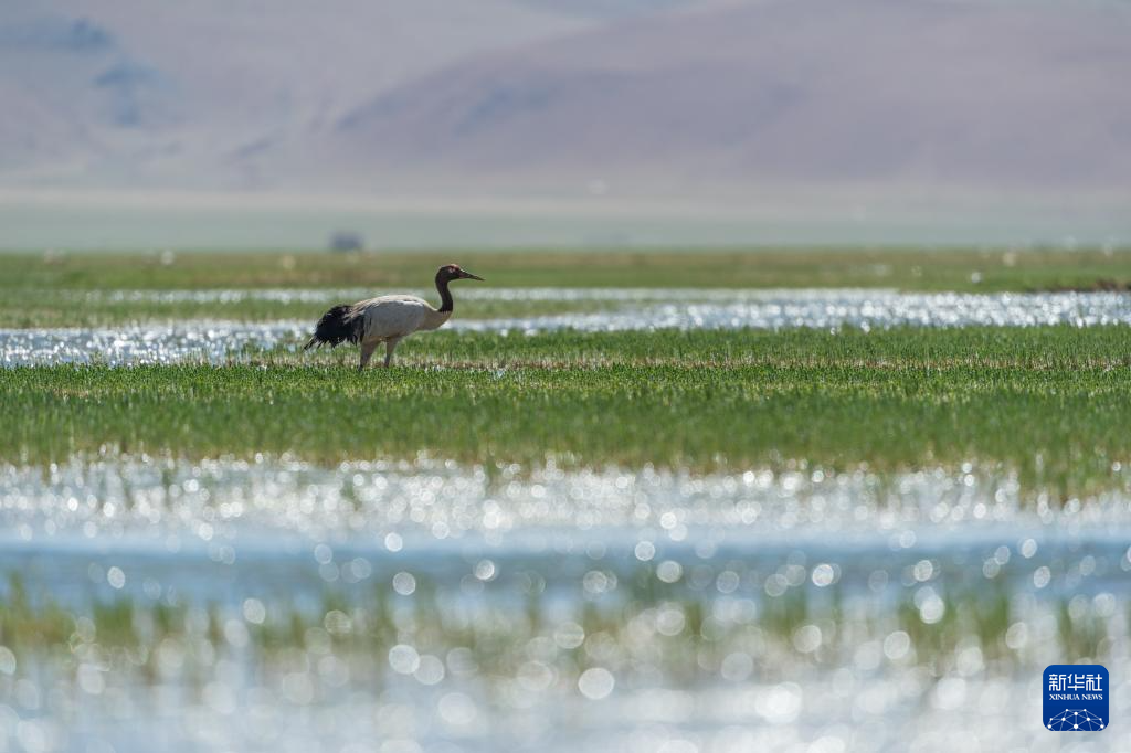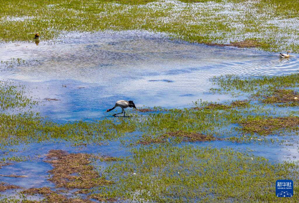 黑頸鶴在濕地和藏羚羊一起覓食(6月8日攝)。新華社記者 晉美多吉 攝