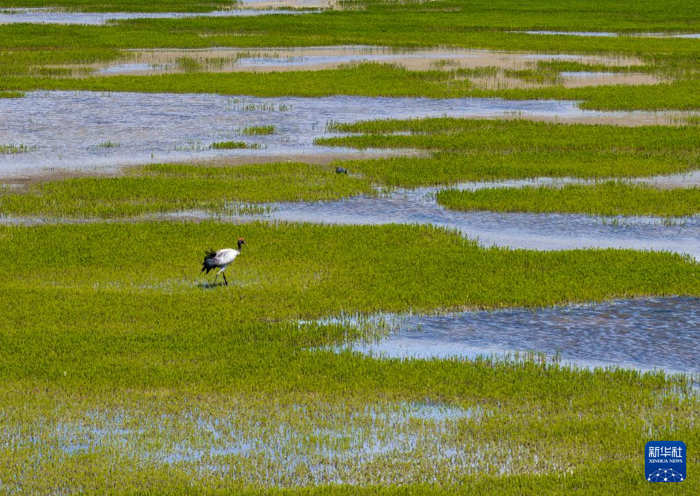 黑頸鶴在濕地覓食(6月8日攝,無(wú)人機(jī)照片)。新華社記者 姜帆 攝