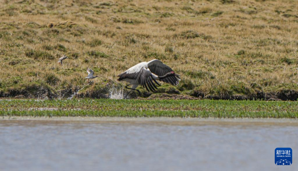 黑頸鶴在濕地飛翔覓食(6月7日攝)。新華社記者 晉美多吉 攝