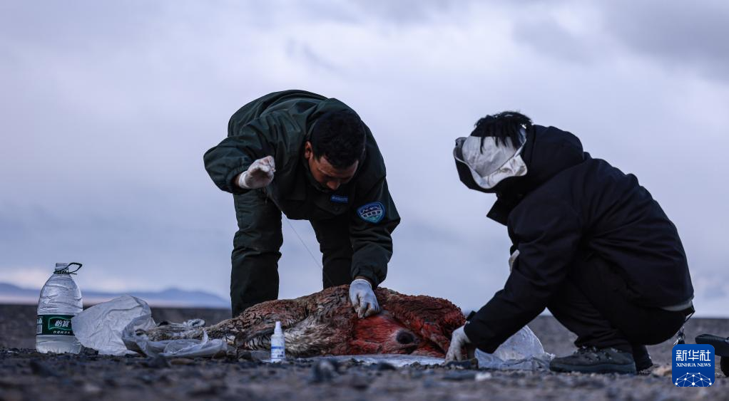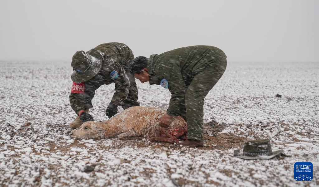 羌塘國家級(jí)自然保護(hù)區(qū)的野保員在救治受傷的母藏羚羊(6月14日攝)。新華社發(fā)(旦增攝)
