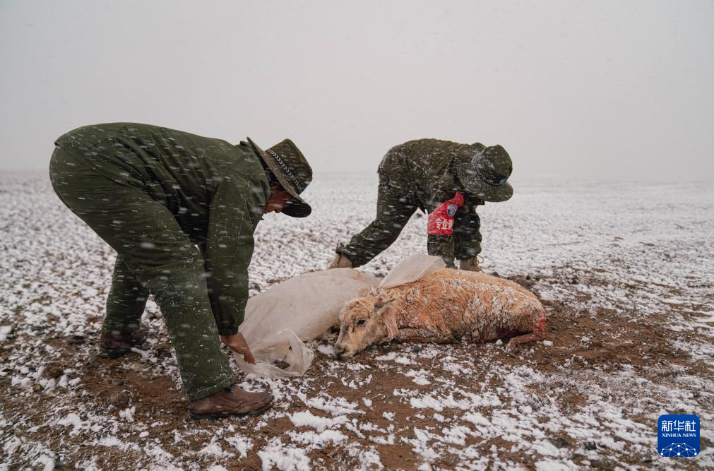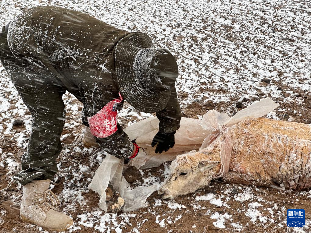 羌塘國家級(jí)自然保護(hù)區(qū)的野保員在安撫受傷的母藏羚羊(6月14日攝)。新華社發(fā)(旦增攝)
