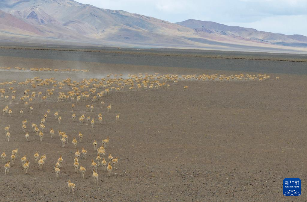 一群藏羚羊因感覺到危險(xiǎn)而開始奔跑(無人機(jī)照片,6月13日攝)。新華社記者 姜帆 攝