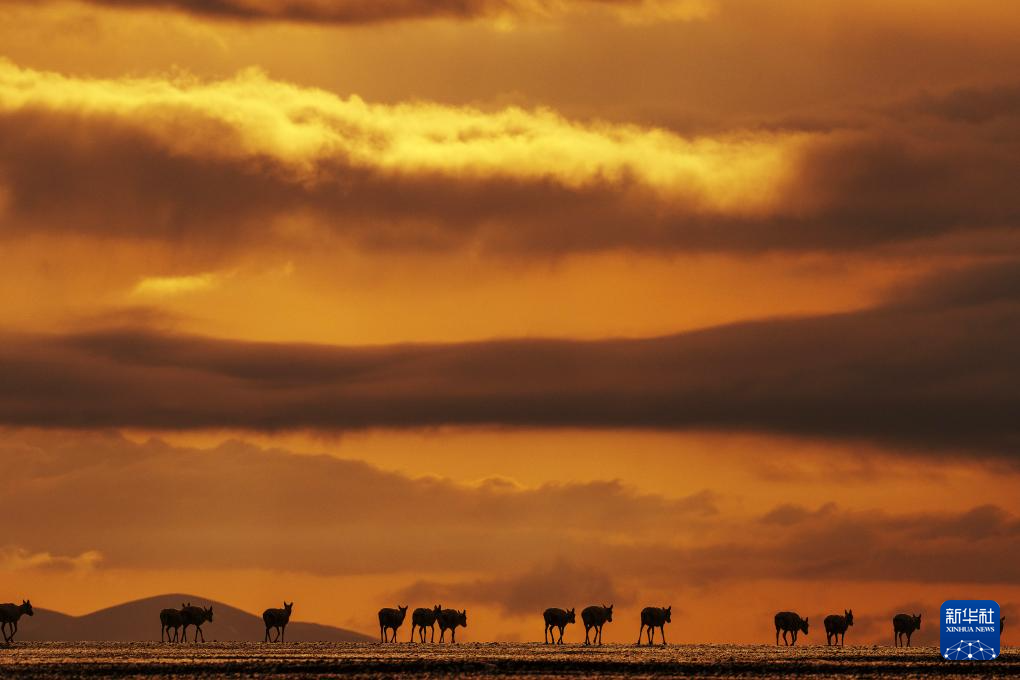 6月14日,在西藏那曲市尼瑪縣境內(nèi)的羌塘國家級(jí)自然保護(hù)區(qū)“無人區(qū)”深處,一群藏羚羊迎著朝陽,行進(jìn)在遷徙路上。新華社記者 費(fèi)茂華 攝
