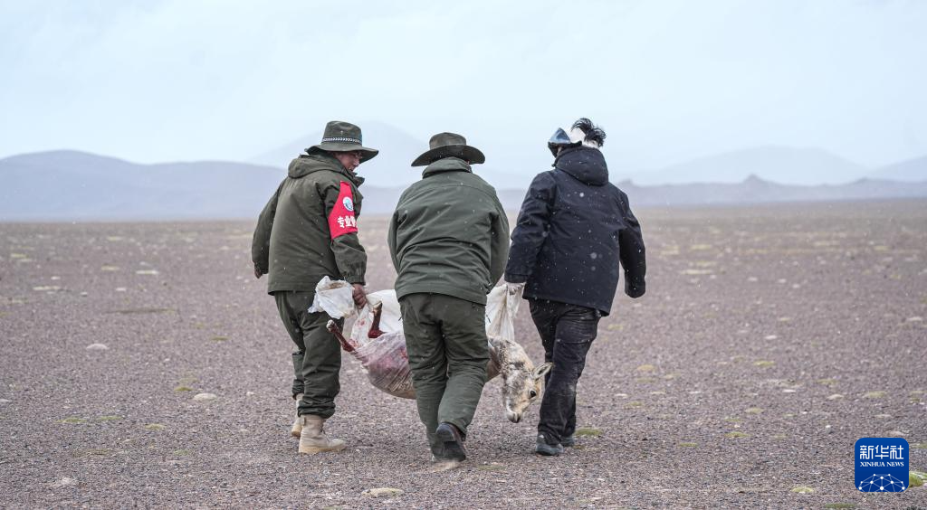 羌塘國家級(jí)自然保護(hù)區(qū)的野保員把受傷的母藏羚羊抬到臨時(shí)營地附近(6月14日攝)。新華社發(fā)(旦增攝)