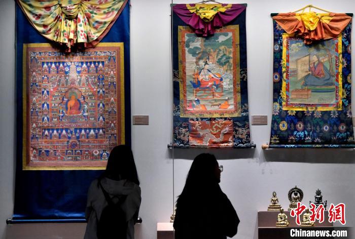 隨著西藏旅游旺季的到來,“高原城市會(huì)客廳”西藏博物館也迎來參觀熱潮。圖為6月19日,觀眾正在欣賞展陳的唐卡。中新社記者 李林 攝