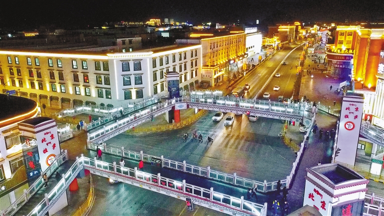 北京市第九批援藏工作隊(duì)投入1743.4萬元建設(shè)的、拉薩首座配置電梯的城市人行天橋—“連心橋”。