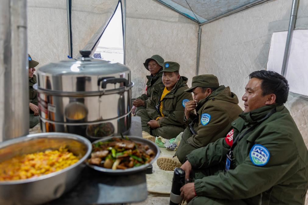 野生動物專業(yè)管護隊員們在巡護途中宿營的帳篷內(nèi)準(zhǔn)備吃飯(5月7日攝)。新華社記者 姜帆 攝