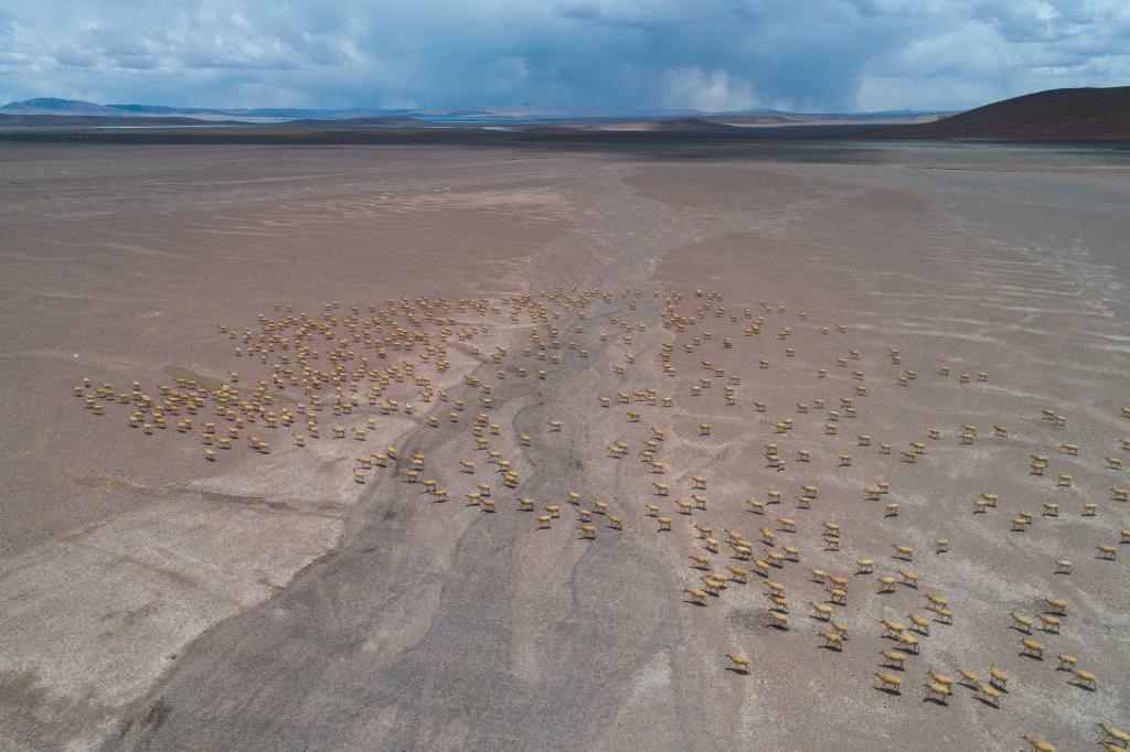2024年5月10日,在羌塘國家級自然保護區(qū),大群懷孕的雌性藏羚羊開始集結(jié)成群,向產(chǎn)羔地遷徙。
