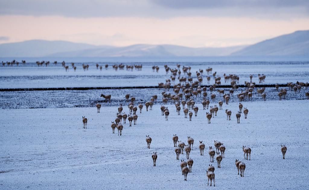 ↑ 在羌塘國家級自然保護區(qū),藏羚羊在覓食。