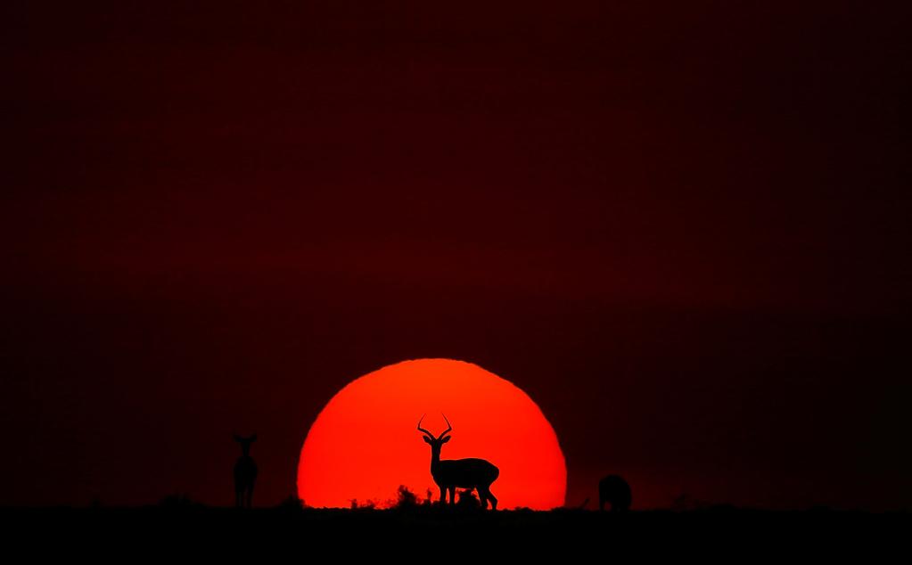 ↑ 在馬賽馬拉國家保護區(qū),遷徙中的野生動物在夕陽下覓食。