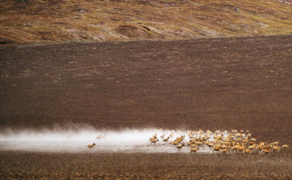 ↑ 在羌塘國家級自然保護區(qū),遷徙中的藏羚羊因為感受到危險而奮力奔跑。