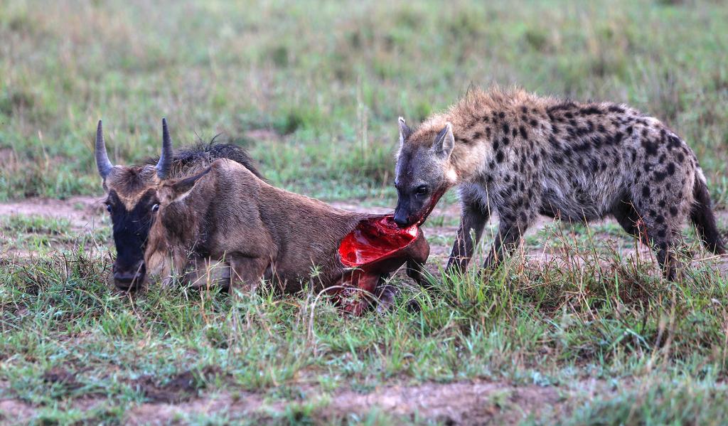 ↑ 在馬賽馬拉國家保護區(qū),一頭遷徙中的角馬成了鬣狗的食物。在角馬遷徙過程中,獅子、獵豹、花豹、鬣狗以及馬拉河中的鱷魚等掠食動物環(huán)伺其周,伺機而動。