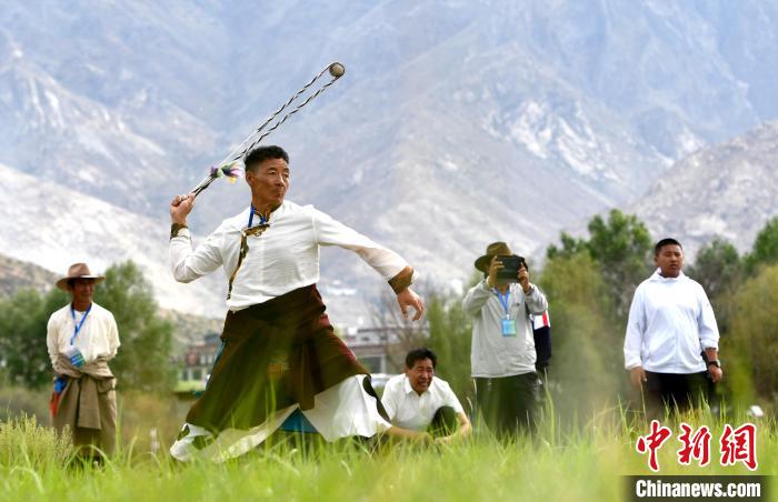 古朵指的是用牦牛毛或者山羊毛編織成的拋石繩,可以將石頭投擲到較遠(yuǎn)的地方,是牧民們用來放牧的工具。圖為6月23日拉薩首屆農(nóng)牧民運(yùn)動會上,參賽選手正進(jìn)行古朵比賽。中新社記者 李林 攝
