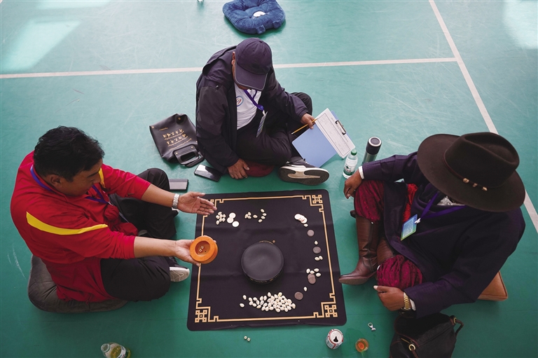 當(dāng)日,“吉韌”“秀茲”等項目一同開賽。 “吉韌”也叫藏式克郎球,是藏族的一種彈指運動。比賽在一張邊長約1米的正方形木桌球臺上進(jìn)行,球臺四角有4個小洞,黑、白兩種扁圓形球子各9個,另有1個紅色球子放置在球臺中心,1個白色母球供雙方彈擊球子所用。