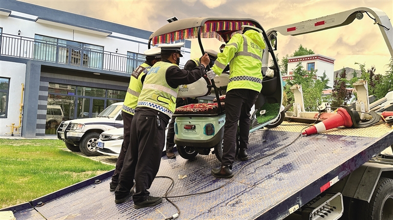 6月19日18時(shí)許,記者來到拉薩市城關(guān)區(qū)江蘇東路與嘎瑪貢桑路交叉口,此時(shí)正值下班高峰期,各類車輛川流不息,十分繁忙,拉薩市公安局交警支隊(duì)城南大隊(duì)的民警們一邊疏導(dǎo)交通,一邊開展電動三輪、四輪車專項(xiàng)整治行動。沒過多久,一輛電動三輪車準(zhǔn)備通過路口,民警丹增發(fā)現(xiàn)該車輛存在非法改裝現(xiàn)象,便立即上前將車輛引導(dǎo)至安全位置,檢查后發(fā)現(xiàn)駕駛?cè)怂阶詾檐囕v加裝遮陽篷,上路行駛存在較大安全隱患,便按照相關(guān)法律法規(guī)暫扣車輛。丹增告訴記者:“我們會將暫扣的車輛統(tǒng)一停放,等駕駛?cè)私邮芴幜P并提交相關(guān)資料后,才能領(lǐng)回車輛?!?/p>