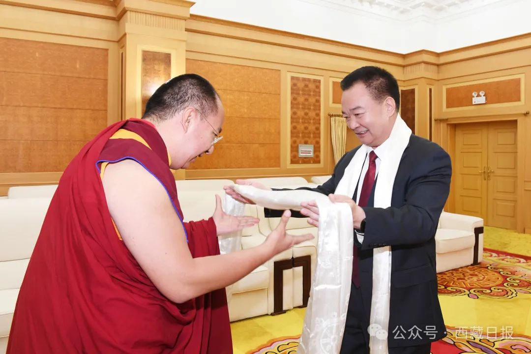 6月26日下午,自治區(qū)黨委書記王君正在拉薩會(huì)見班禪額爾德尼·確吉杰布。這是王君正與班禪額爾德尼·確吉杰布互獻(xiàn)哈達(dá)。記者 李洲 攝
