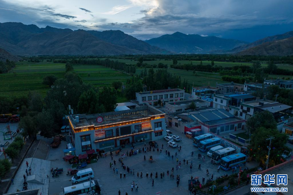 6月24日,游客在扎西曲登社區(qū)廣場(chǎng)體驗(yàn)篝火廣場(chǎng)舞。新華網(wǎng) 旦增努布 攝