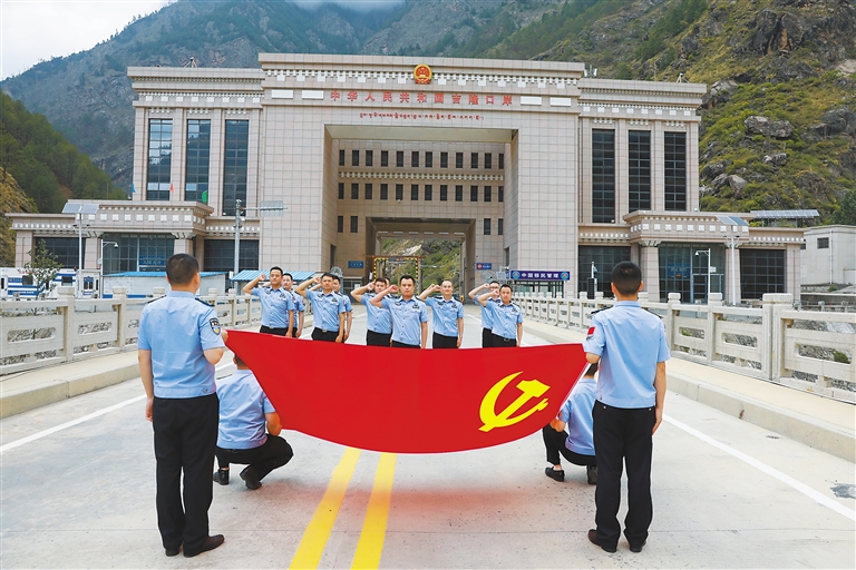 圖為吉隆出入境邊防檢查站組織黨員民警在國門前重溫入黨誓詞。記者 旦增蘭澤 通訊員 肖富貴 攝