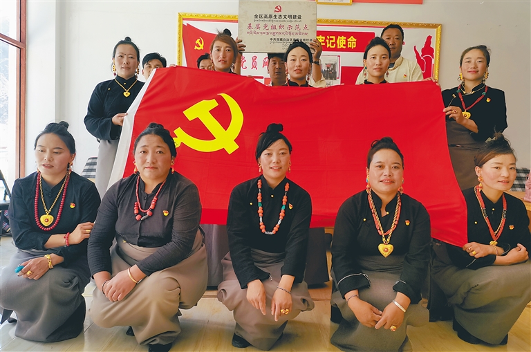 圖為昌都市察雅縣卡貢鄉(xiāng)卡貢村黨員們與黨旗合影。記者 萬慧 通訊員 劉林曉 攝