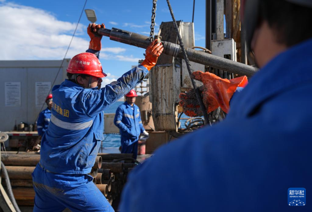 7月11日,鉆探人員提起內(nèi)管,準(zhǔn)備提取湖泊巖芯。新華社記者 晉美多吉 攝