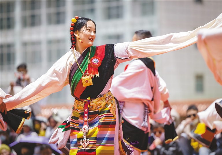 身著特色藏族服飾的巴青縣群眾在“鄉(xiāng)村振興 那曲奮進”傳統(tǒng)舞蹈大賽上表演舞蹈。萬靖 攝