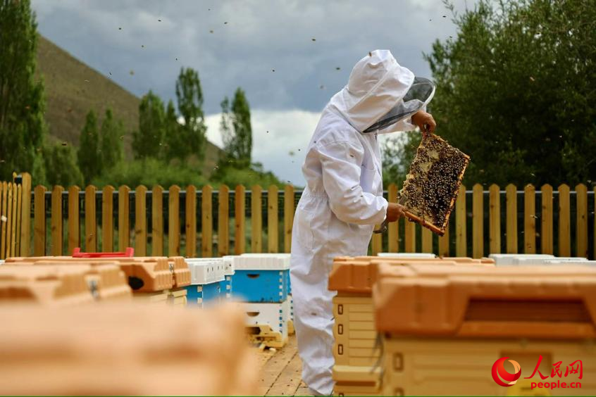 工作人員正在查看蜜蜂狀態(tài)。人民網(wǎng)記者 次仁羅布攝