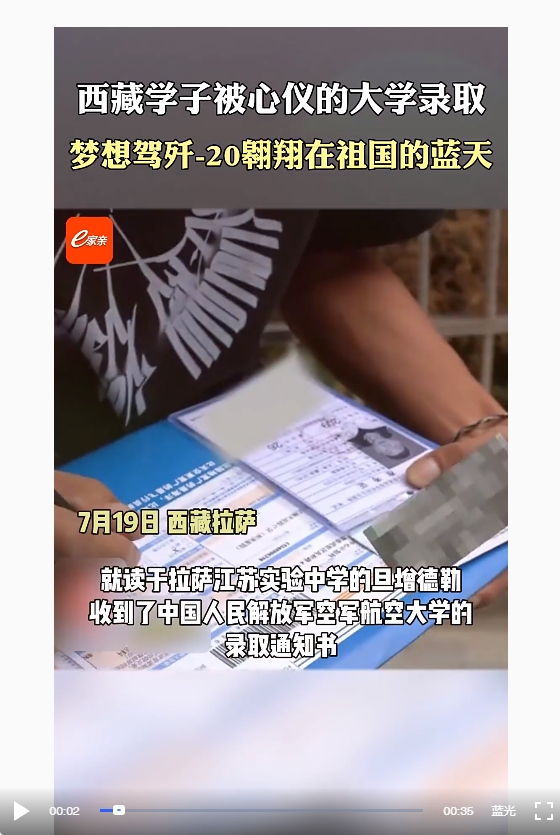 西藏學(xué)子被心儀的大學(xué)錄取 夢(mèng)想駕殲-20翱翔在祖國(guó)的藍(lán)天
