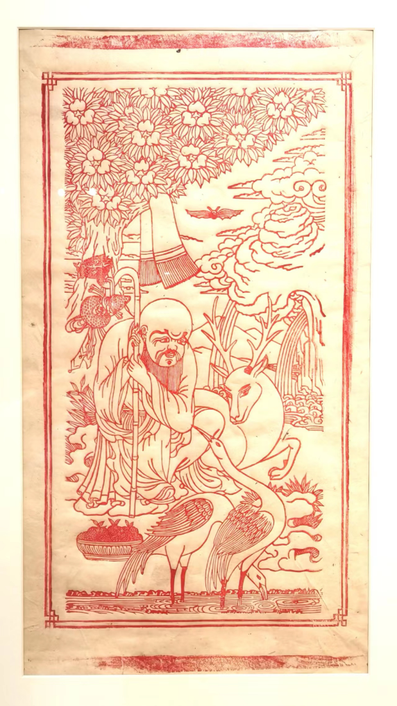 雕版拓片《六長壽》,印有長壽巖、長壽老人、長壽水、長壽樹、長壽鶴、長壽鹿六樣元素,是西藏經(jīng)典的風(fēng)俗畫題材,其中長壽老人還有內(nèi)地壽星形象的標(biāo)志性凸額。由于寓意吉祥,它出現(xiàn)在唐卡、家用藏式柜彩畫以及布達(dá)拉宮的壁畫上。
