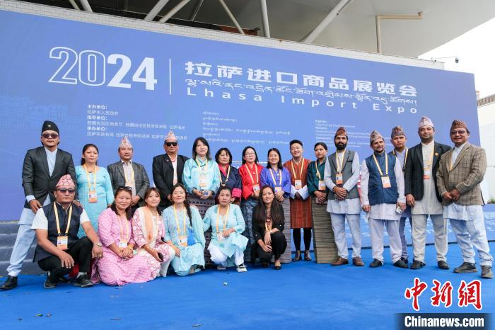 8月4日,來(lái)自尼泊爾和不丹的參展商在拉薩進(jìn)口商品展覽會(huì)開幕式現(xiàn)場(chǎng)合影留念。中新社記者 江飛波 攝