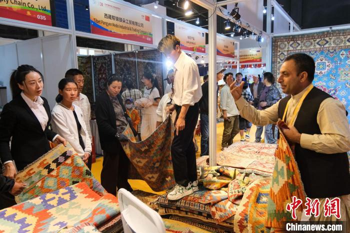 來(lái)自阿富汗喀布爾的商人阿明扎伊·穆罕默德·賈(Aminzai Mohammad Jan)主要銷售阿富汗毛毯等手工藝品,這是他第二次進(jìn)藏展銷?,F(xiàn)場(chǎng),阿明扎伊·穆罕默德·賈十分忙碌,不斷為顧客挑選合適的款式和花色,顧客砍價(jià)時(shí),他便掏出手機(jī)播放毛毯的制作過(guò)程。他說(shuō),期待這次銷量更好。