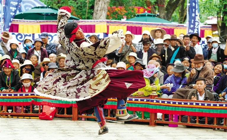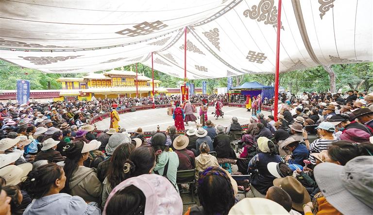 左圖:8月8日,山南市洛扎縣曲措藏戲隊(duì)在羅布林卡表演傳統(tǒng)藏戲《卓瓦桑姆》。