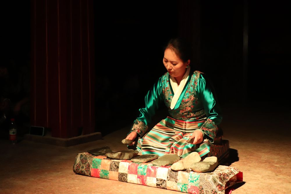石琴使用天然的石塊作為伴奏樂器,從遠古開始就在高原上被人演繹。演奏者手持兩塊小石頭,跪坐在幾塊類似琴鍵的大石頭前,大小石頭在不同位置碰撞出不同的音高,演奏者按一定音階順序將石頭排列在琴架上,演奏出悅耳的旋律。