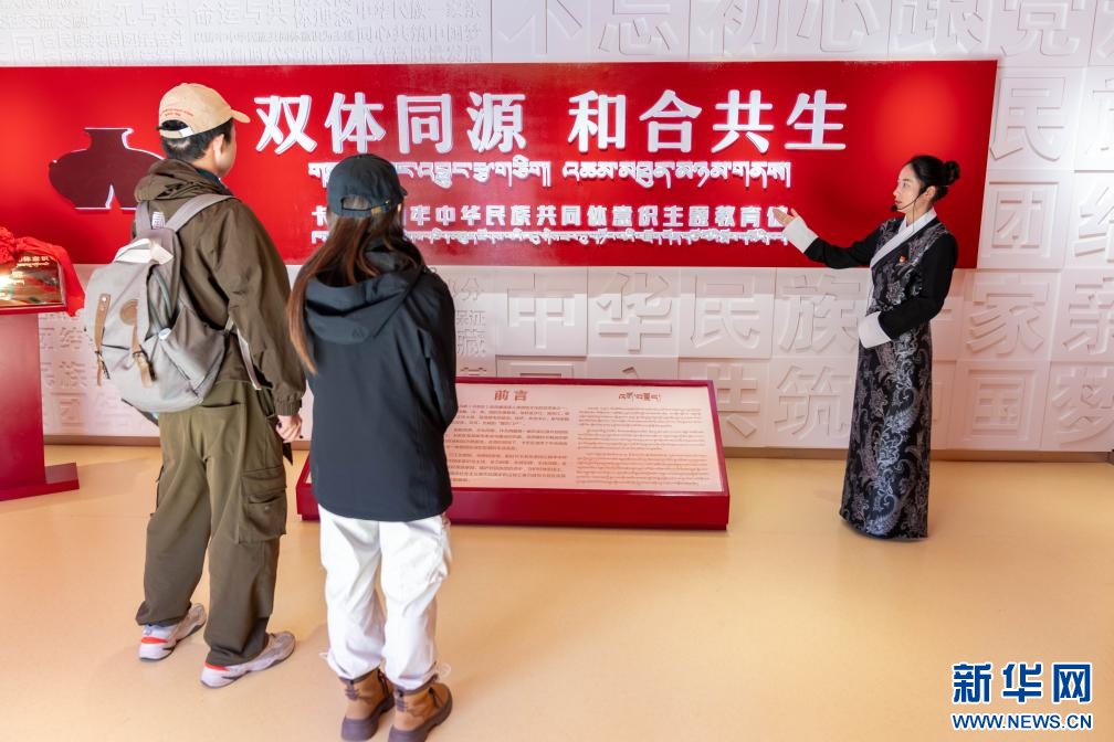 主題教育館的講解員嘎西卓嘎在講解民族團結故事(8月19日)。新華社記者 旦增尼瑪曲珠攝