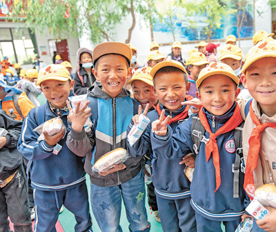 在西藏那曲市班戈縣中石化小學(xué),學(xué)生手拿營養(yǎng)餐等待放學(xué)。新華社記者 丁增尼達(dá)攝