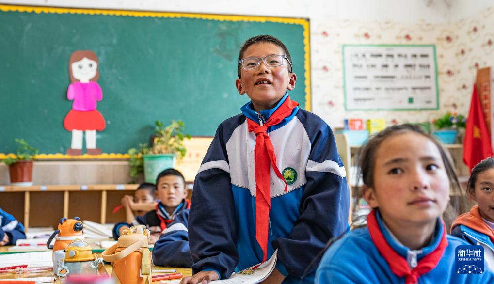娘蒲鄉(xiāng)中心小學(xué)學(xué)生貢喬熱旦正在課堂上回答問題(9月3日攝)。新華社記者 丁增尼達 攝