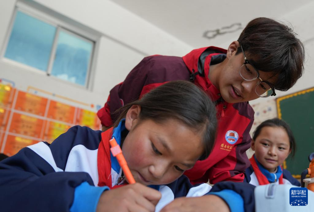 胡正培輔導(dǎo)學(xué)生課業(yè)(9月3日攝)。新華社記者 晉美多吉 攝